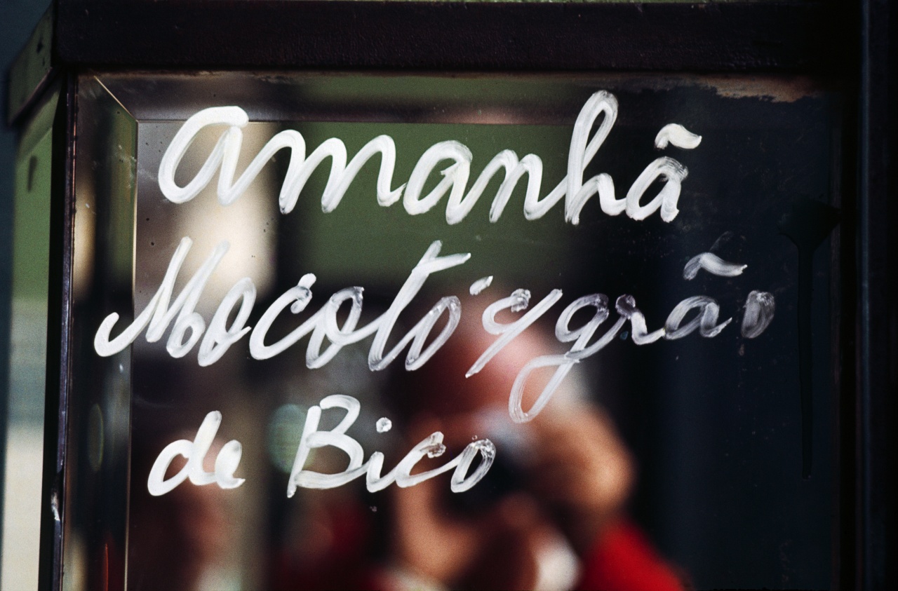 Cardápio escrito no vidro e reflexo do fotógrafo em segundo plano, Brasil, s.d. Foto de David Zingg/ Acervo Instituto Moreira Salles.